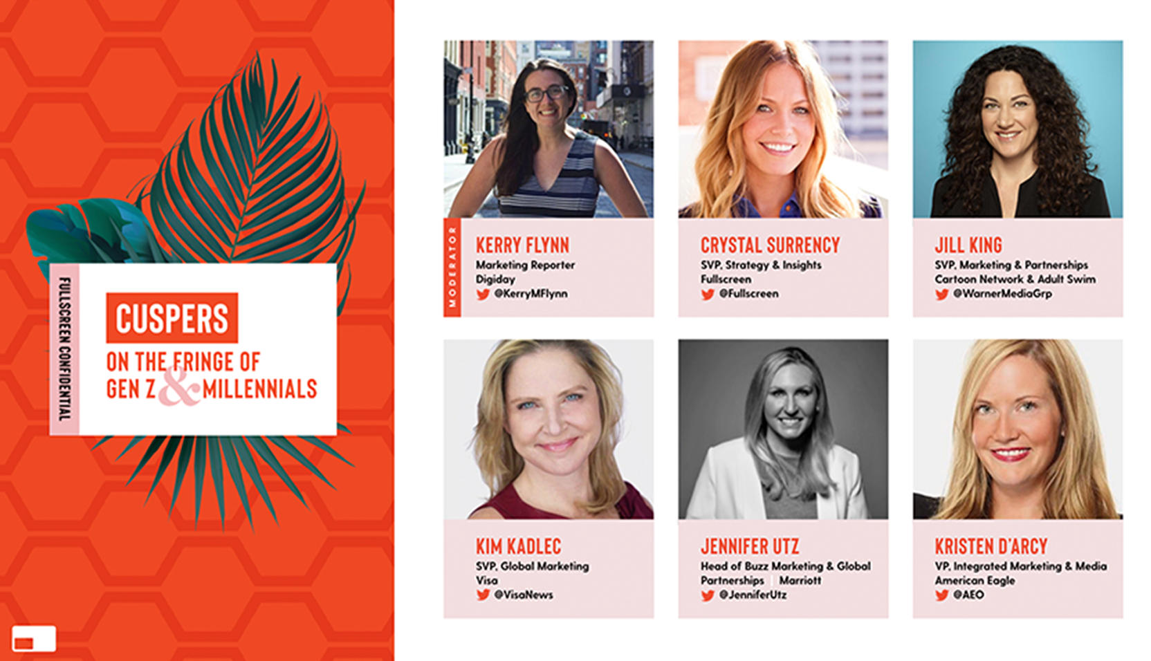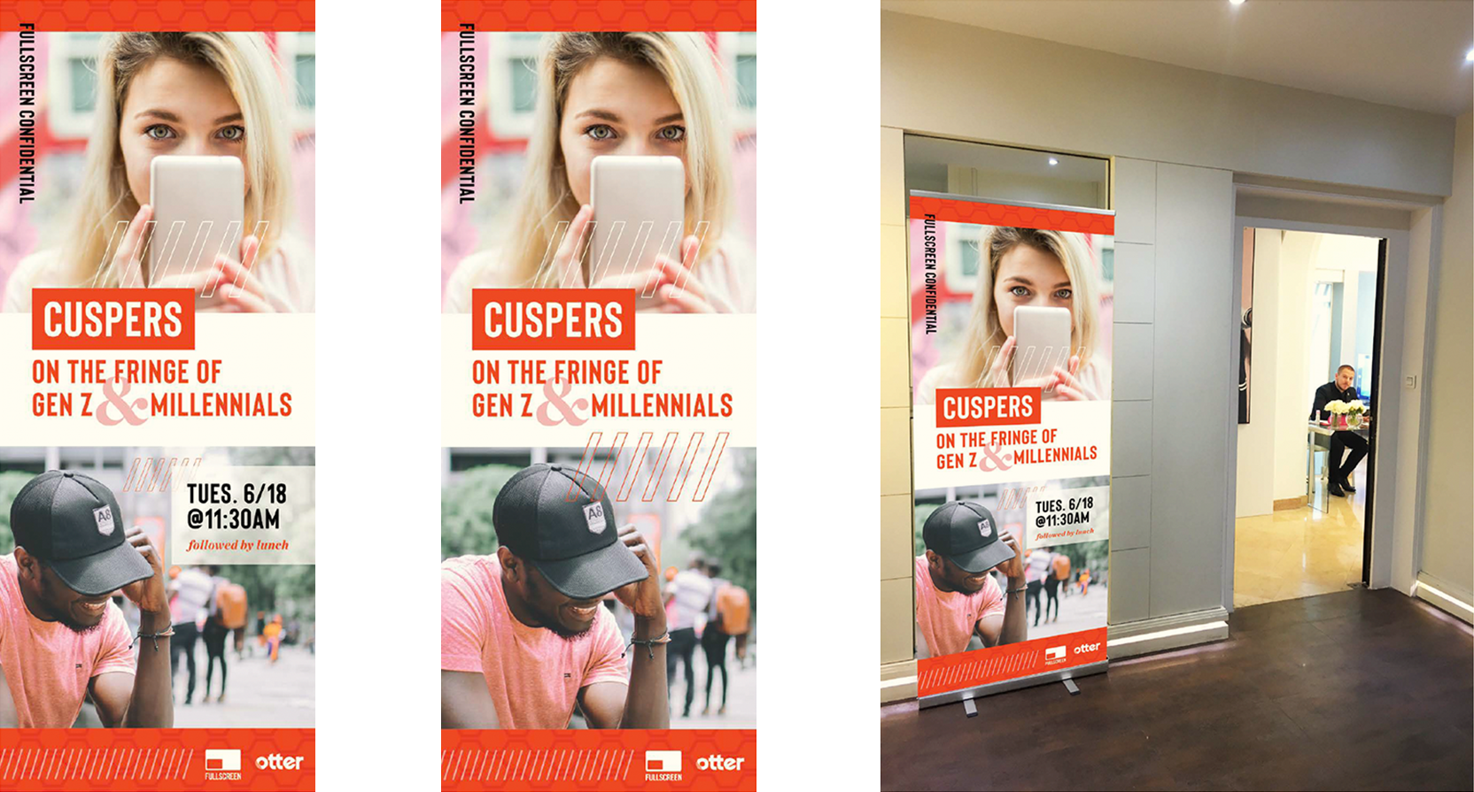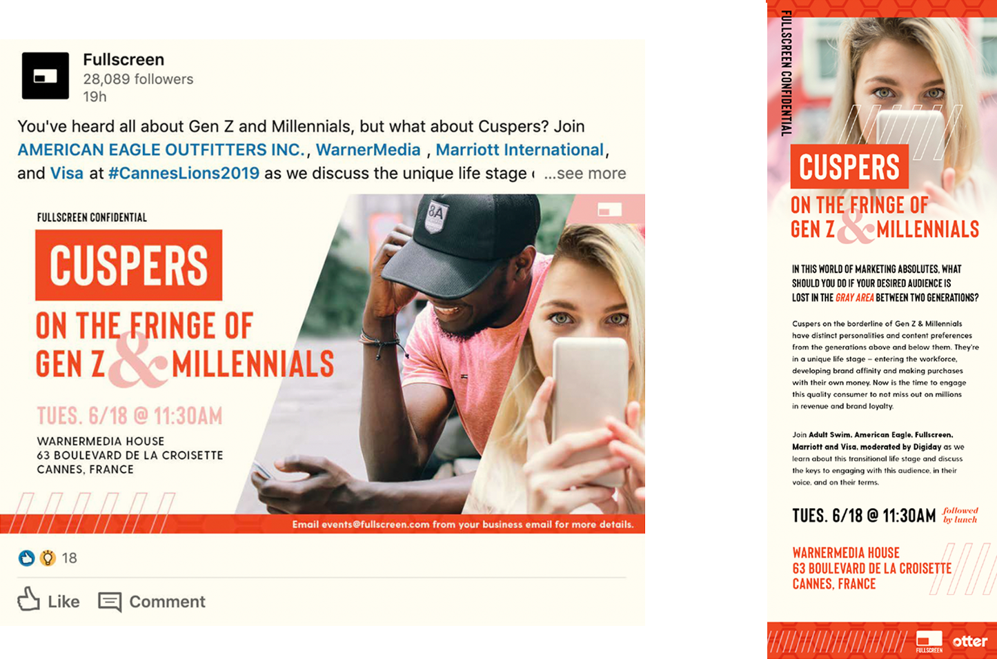 Designed and art directed branding and materials for Fullscreen’s panel showing at Cannes including everything from environmental signage to digital invites, panel presentation slides, info cards and banners. Fullscreen partnered with WarnerMedia whose goal was to brand-meld with Fullscreen for a youthful but elevated look & feel.