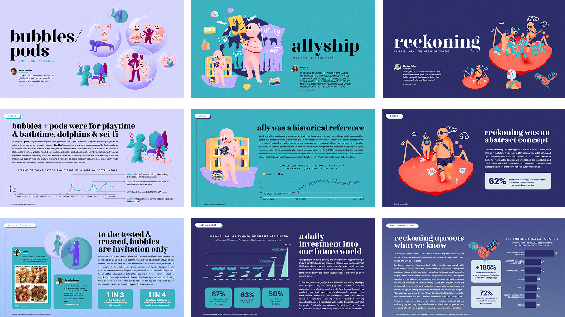 Additionally, provided creative and art direction on a full report for the Fullscreen Strategy & Insights team during Covid-19. This project was a large combination of conceptualization, data visualization, designer and illustrator management as well as cross-functional teamwork and ideation.