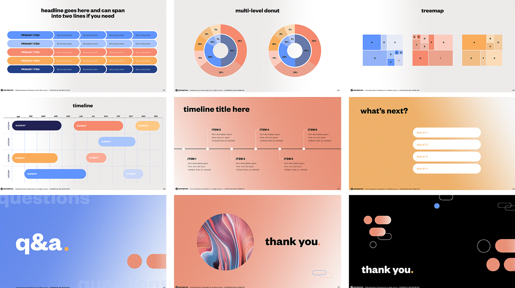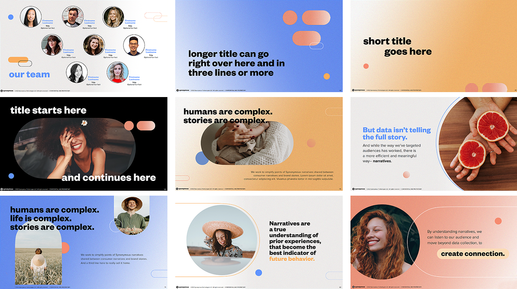 Update Synonymous Co.’s branding toolkit using existing elements, design language and new data visualization to elevate the brand. The toolkit newly includes instructions on slide use and design choices for various decks as well as straightforward data and chart slides for a streamlined but colorful visual identity.